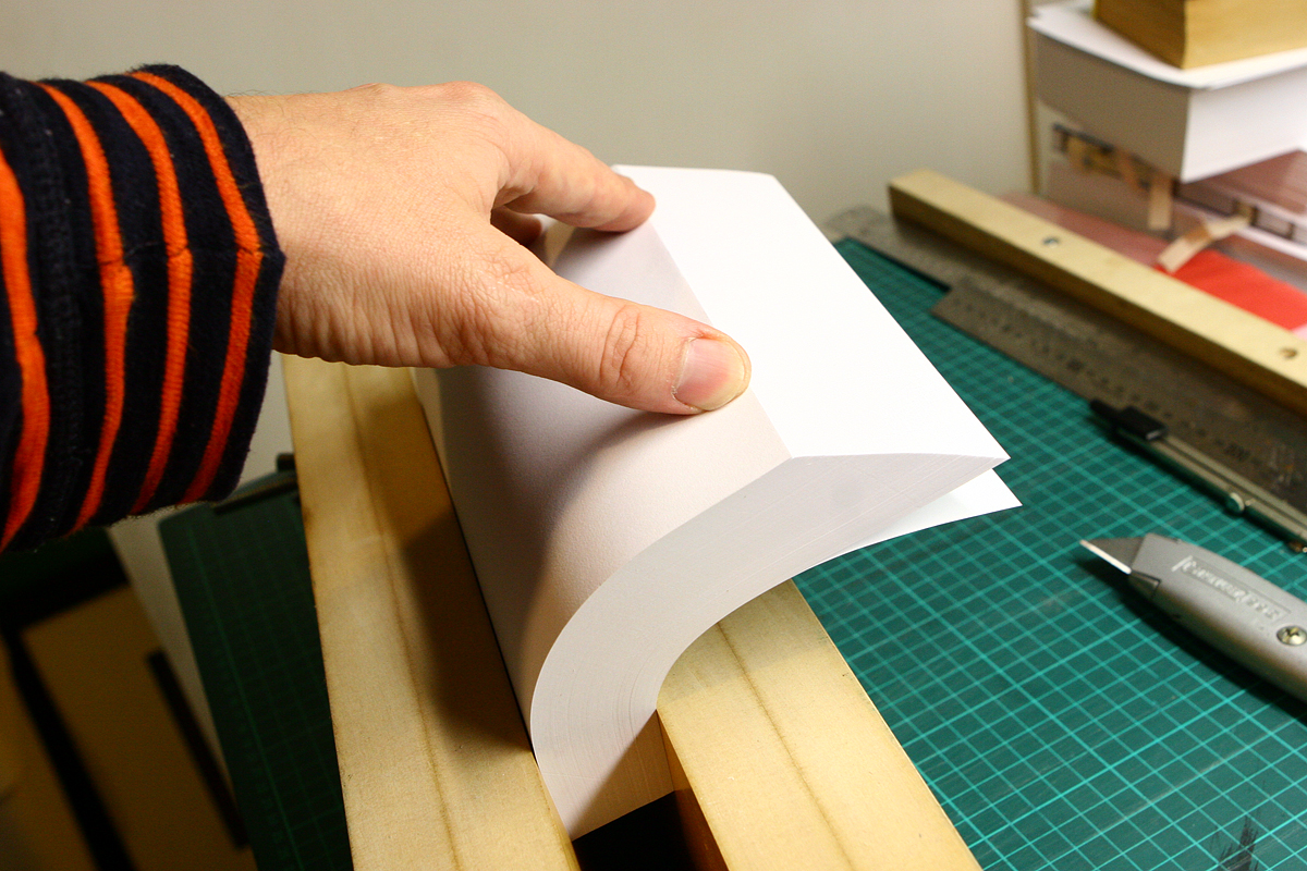 Fanning Published May 11, 2012 at 1200 × 800 in Adhesive Binding is Perfect ← Previous Next → After knocking up and putting the block into your finishing press, practice fanning the pages one way and the other
