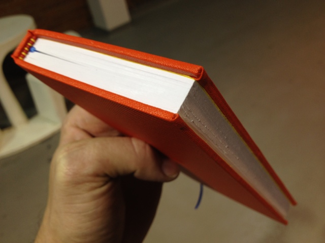 Something that I am very interested in is to see how my binding stands up to everyday use. So far structurally the book is doing well. The only thing I might change next time I bind a book like this is to use a thicker spine hollow (the piece of cardboard that covers the spine) because the thin card I used is deforming at the head and tail, and it shows the lumps and bumps from the sewing and the tapes. The paste I used to attach the Kraft was a bit thin, so some parts of the paper are starting to lift, especially where it overlaps the book-cloth. I’m just going to leave it to see what happens.
